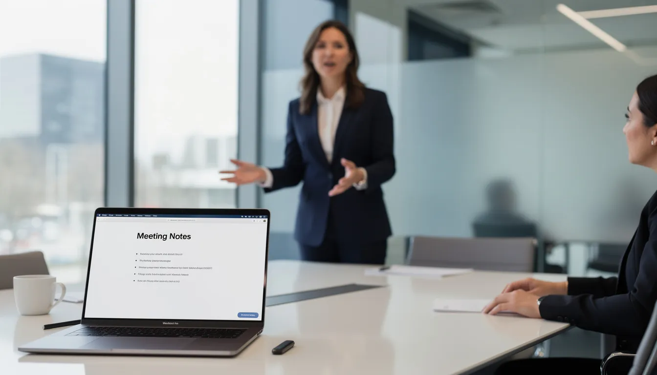A professional is speaking in an office meeting room while a laptop captures notes through voice dictation, utilizing speech recognition technology to transcribe speech into written text in real time. The scene emphasizes productivity tools and the writing process, showcasing how modern dictation apps can streamline documentation and save time for content creators.