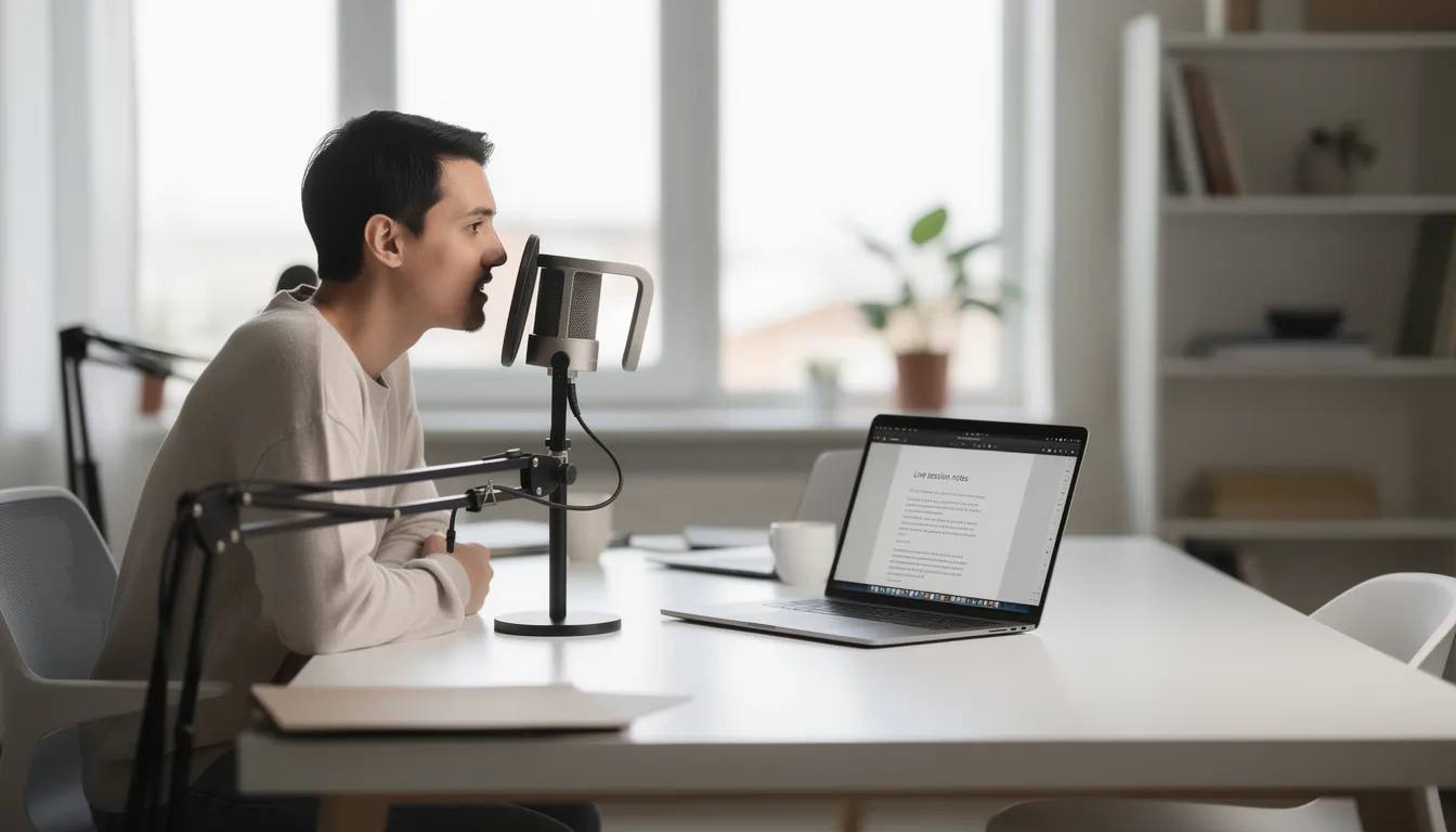A person is speaking into a microphone at a modern desk, while a laptop screen displays text being generated in real time through speech recognition. This setup illustrates the writing process using a dictation app, showcasing how voice dictation can enhance productivity and simplify tasks.
